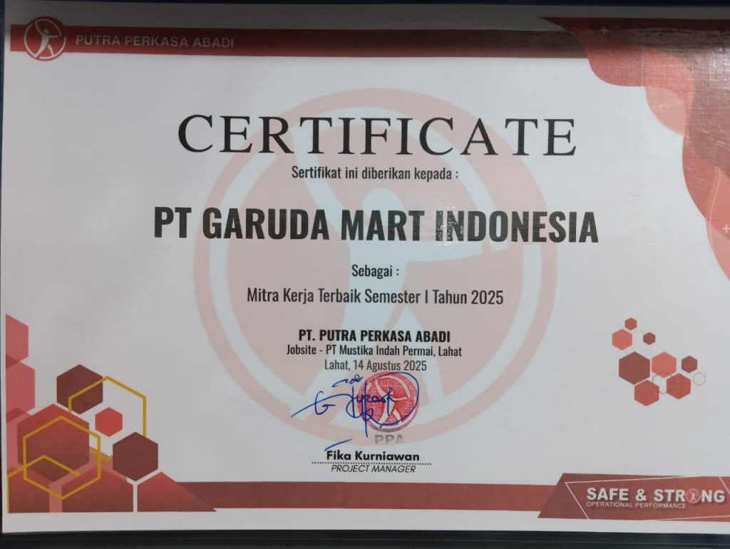 Terima Kasih Atas Kehormatan: Sertifikat Mitra Kerja Terbaik dari PT. Putra Perkasa Abadi